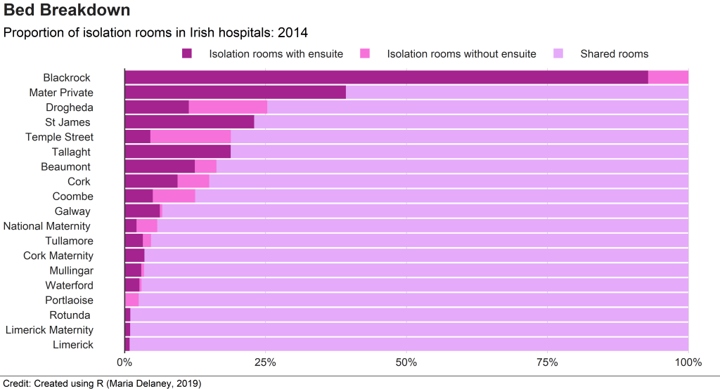 Data was obtained on almost all acute Irish hospitals which enabled a comparative analysis to be done on the proportion of isolation rooms and bed occupancy in each hospital. These are both influential factors in infection control as a lack of isolation rooms and high occupancy rates can lead to the spread of superbugs and other infections.
